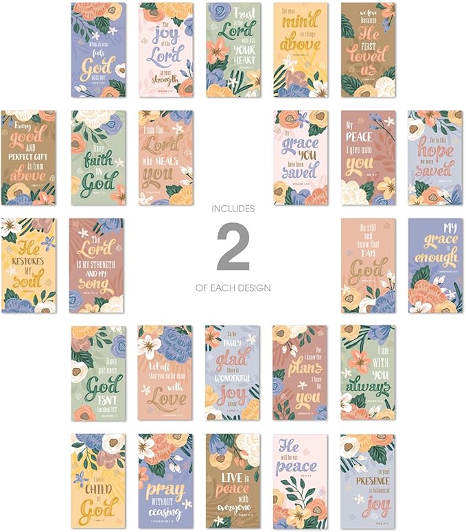 - Uplifting Designs: Set of 25 different designs containing bible verses that make it simple to spread some extra joy to family and friends. There are 2 cards of each design. Printed with high quality materials. Blank white back of card allows room to write your own special message.